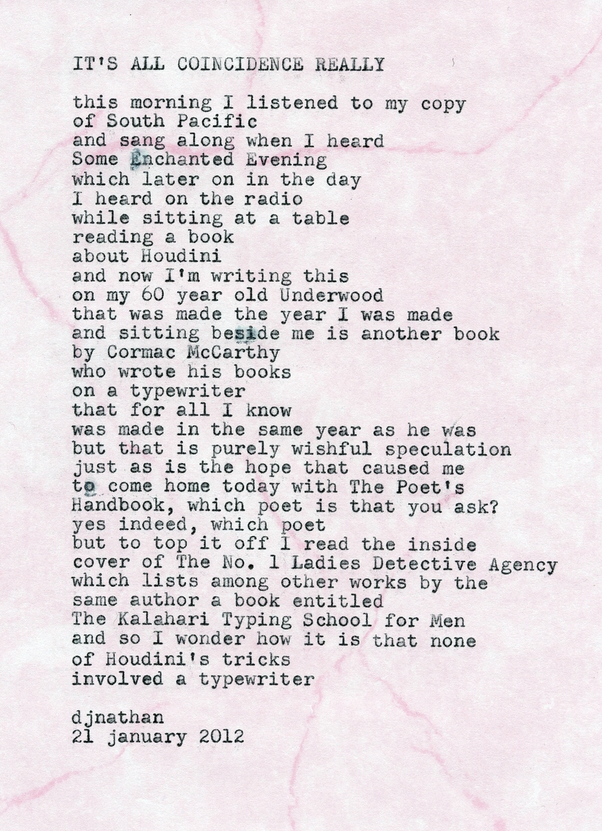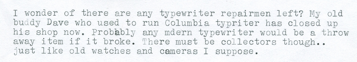 I began to look into the whole typewriter blogging world, and was amazed with all the fascinating things related to typewriters! I went back to the thrift stores with my eyes peeled for more. Now I have 11 typewriters. The latest is the other half of the pair of Underwoods from day one last summer. This one could be called the ugly sister, but basically it seems to have the same essential parts. It’s called the Correspondent c. 1952.