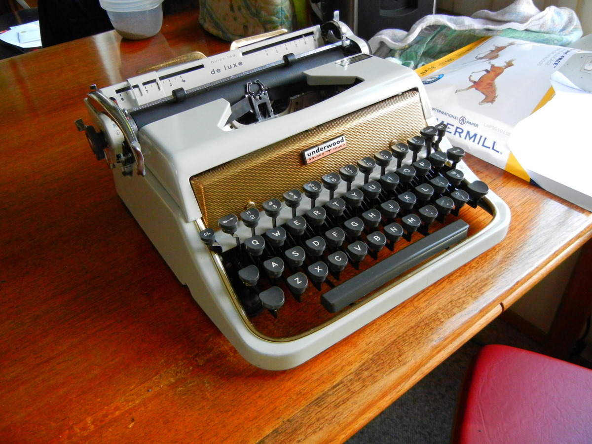Then last June I had an urge to type again, why I cannot imagine. I went to a thrift store and lo and behold here was a pair of Underwood’s. Yes a pair. UnderWOOD. I selected the fancier one, called Golden Touch which had gold trim. It was your basic Universal with all the trimmings c. 1956.
