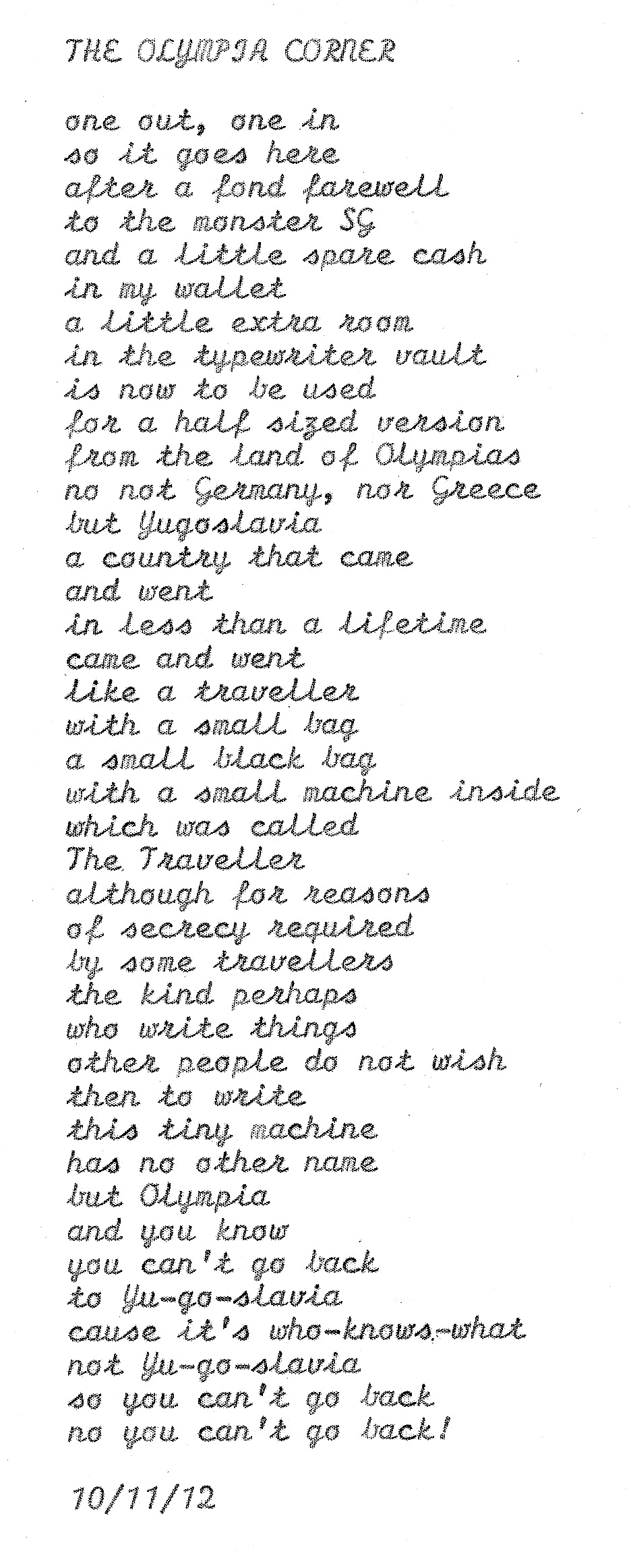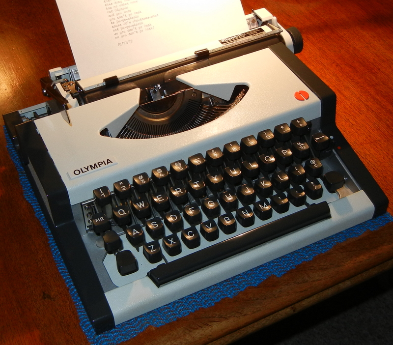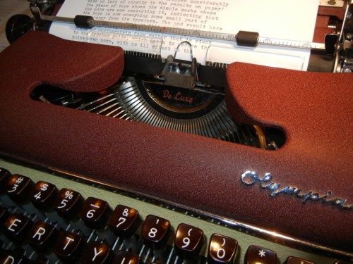 When my friend came to visit from California, I had to show him my typewriters. Then I forced him to write something, which he did. I then edited it for the blog. Then he forced me to watch the World Series. He now knows the difference between an Olivetti and an Olympia, I think… but I still can’t understand baseball. I have to admit it’s a lot more interesting if you drink a few beers though.