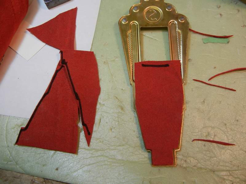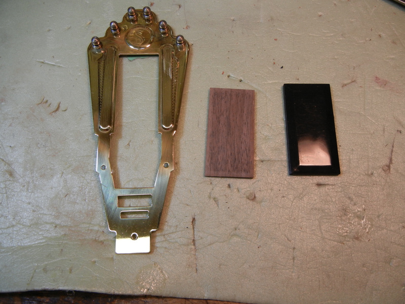 To get on with the guitar making, I removed the cheapo plastic insert from the tailpiece so I could put in a nice matching piece of walnut. A few saw cuts around the edges and in it went. Then I spent half the day wiping on the french polish finish. About twenty coats later it began to shine. Then I put the red leather patch on. This is traditional, and protects the guitar wood from the sharp metal edges. The tailpiece comes flat too, and has to be bent. Clamp in vice and bend 90 degrees – done. To install it has to be dead centre with the neck. I checked this again with my long metal straight edge, and verified the centre line. Right at the butt seam where it was designed to be. Good work!