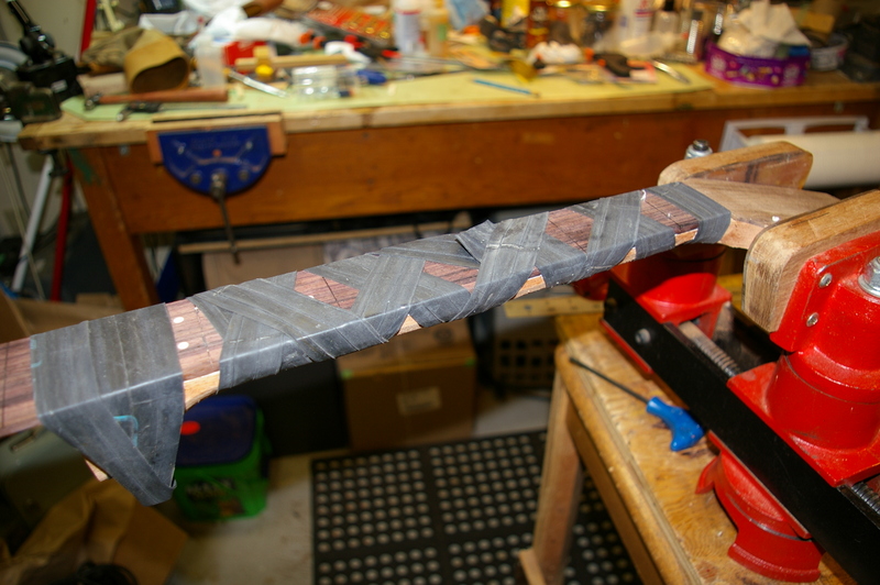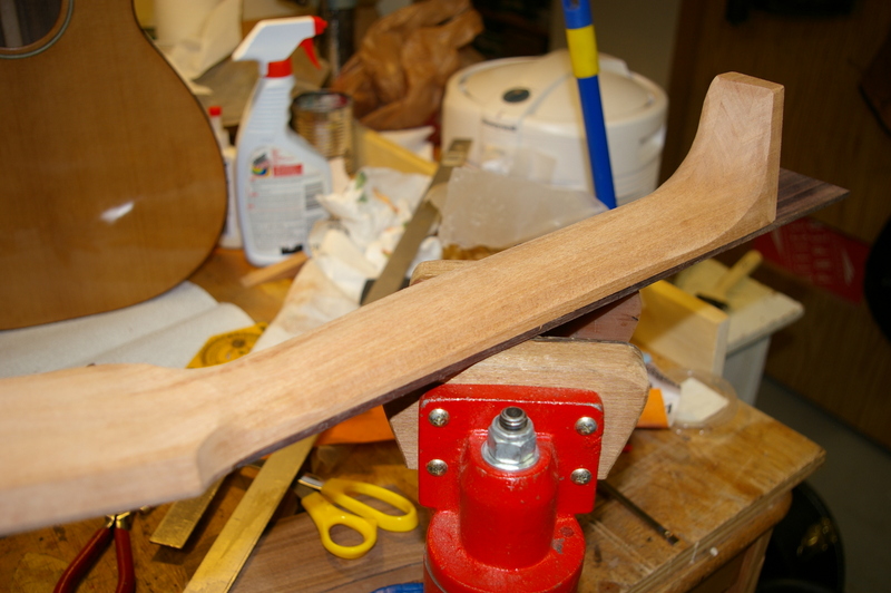 I have a jig to hold the neck. It fits in my swivel jaw vice, which is mounted on my old workmate stand. This workmate has been in use for about 35 years or more and it is one of the must have tools for doing just about anything, never mind guitar building. The swivel jaw vice is also a must have tool for guitar makers.
