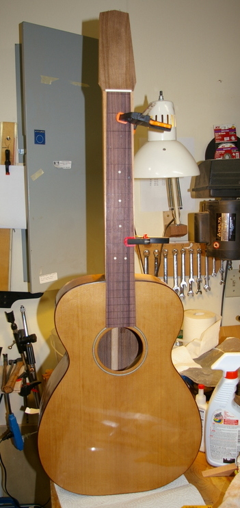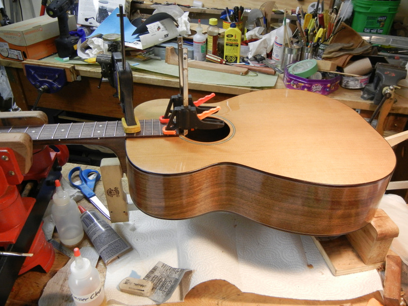 The fingerboard gets glued to the top as well, but doesn’t need much glue. That joint isn’t structural, so minimal glue is required. I sanded off the finish under the fingerboard to get good adhesion. Glue does not stick to shellac very well.
