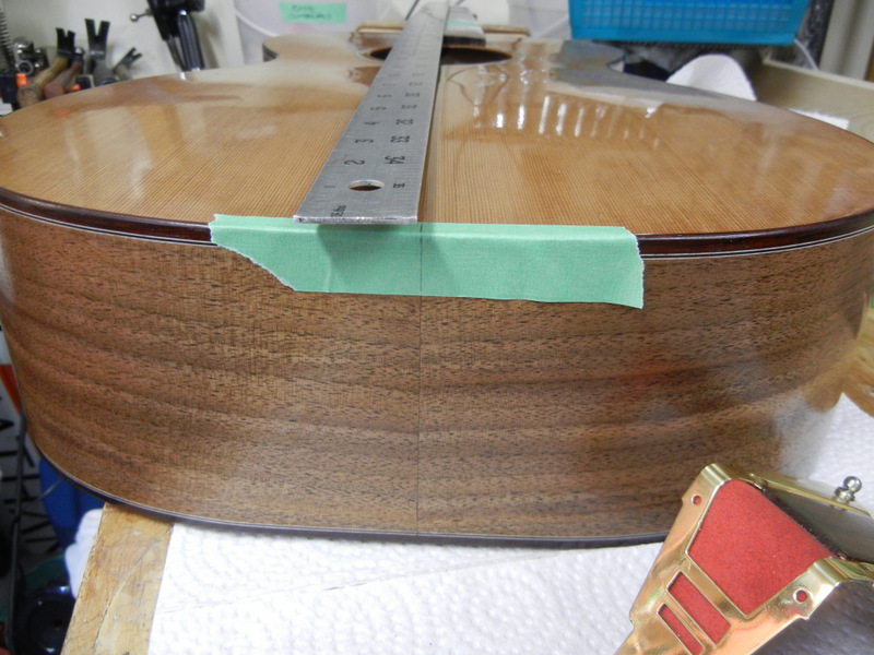 Once the bridge fits the top the carving begins. I use a long stick with a half pencil on the end to mark the bridge height. I shim the 12th fret to get the required string height that I want. Then I remove the excess wood from the bridge blank.