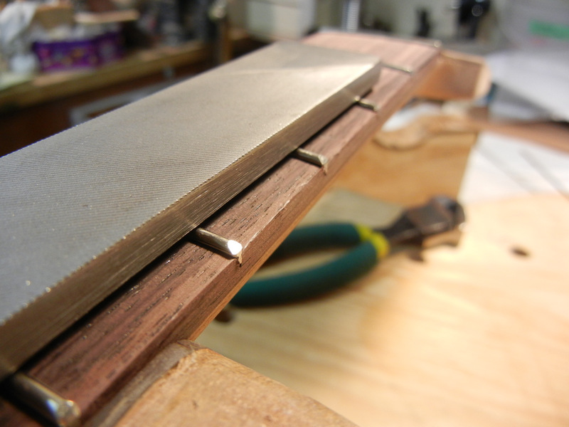 Hammering in frets has to be done carefully. You tap in one end, then the other end. Then you work both ends towards the centre, hoping that the ends don’t pop up. Sometimes they do and then you tap them down or glue them if they won’t stay seated.
