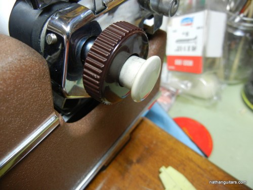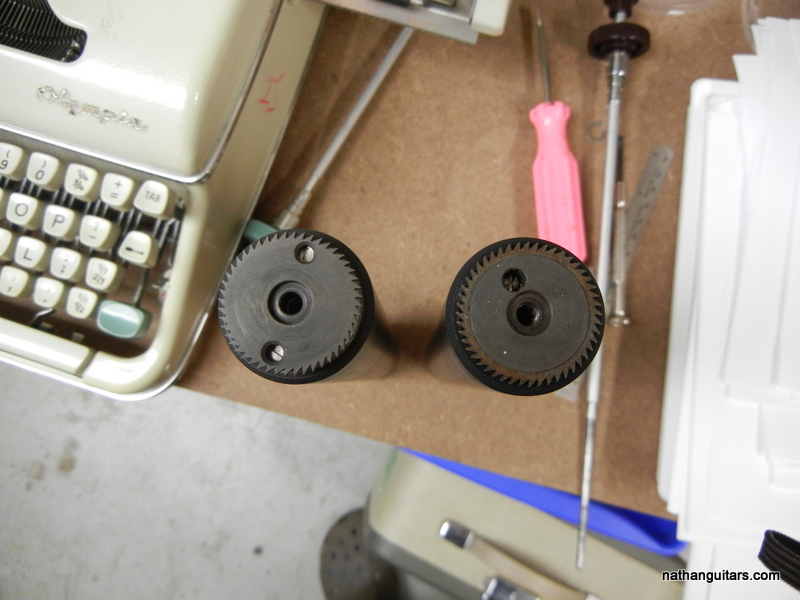 I removed the platens from the SM5 and the SM4 to have a look and compare. As it turned out, they were interchangeable, with one caveat: the internal clutches were different, so each platen would have to retain its spindle. That meant the plastic button on the right hand end would stay with its platen. So the SM4 got a white button, and the SM5 got a brown one. The other knobs were interchangeable.