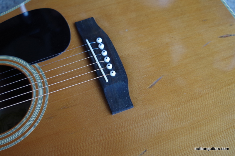 I didn’t know anything about these guitars before but I’m wise now. This one is quite excellent. It has a fine top of solid spruce, and the bracing is pretty much standard post-war Martin Dreadnought. The body is all laminates but that is not a problem here – this thing has killer vibes! The post-war Martins had their braces moved back an inch to make the tops less prone to warping, as well as having straight braces, as opposed to the earlier scalloped design. There are heated arguments on both sides as to which design is best. Taking advantage of this, Martin now makes some models with “forward shifted scalloped bracing”. This is basically their old design made new again. But every design change to a musical instrument has consequences. The new old design being lighter braced, and forward-shifted means the sound is bigger and has even more overtones. Some players like this sound, and are convinced it’s better. Others say it tends to muddiness. All those overtones cannot be had without a concurrent change in the whole dynamic, which means you lose clarity of the fundamental note. I love the clarity of this guitar, which I would attribute somewhat to the “tighter” bracing of the old=new post-war backward-shifted non-scalloped design. Whew! One difference I observed in the bracing vis-a-vis the Martin standard, is that the main x-braces appear thicker but lower. So Suzuki copied Martin, but not quite exactly.