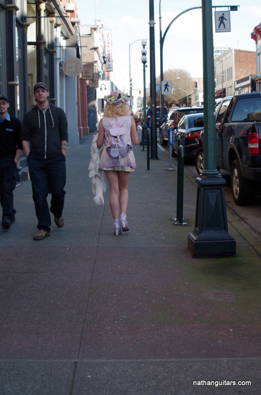 One theme about art which I’ve heard all my life is that what’s left out is as important as what’s put in. In architecture school, my most influential teacher said the best buildings looked simple, a sign of great skill in their design. Many great photographs were cropped from the original shots to achieve their best impact. I was looking at a picture I shot on the street recently, of a girl dressed up in various shades of pink. She had obviously gone to great lengths to achieve her look and it certainly drew my attention. But looking at the picture I began to notice things I hadn’t seen when I took it. Two men were coming, both dressed in black, with not the slightest nod to fashion. I couldn’t figure out if the picture worked this way or that, however, despite trying various crops – until I tried a function called ‘Cinemascope’. This removed even more than I had done in all my experiments, but I found it nevertheless had more impact. I give you both shots here, the original and the ‘Cinemascope’ version, for you to judge what works best.