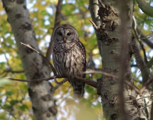 Daylight time has gone. Today I ate lunch at 11.30 since my stomach is still on its former schedule. Before the light faded this afternoon I decided to head out around the lake for a quick walk before dark. Good thing too, because the sun was sinking low as I left. I grabbed the camera on my way out, and fixed the big zoom lens, just in case. I haven’t carried this camera for months, but I had a hunch today might be the day – the day the owl returns. Until recently the leaves have been hiding the life that is now visible since they are rapidly falling. What they reveal is very interesting.
