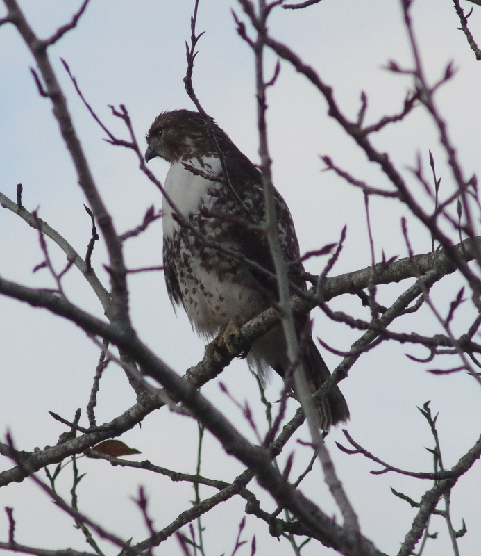 Continuing on I crossed the new floating bridge and was pleased that the far end of the trail will never again be flooded over, since they raised a berm there about 4 feet high. Around the backside and turning east I glanced up to see a Red Tailed Hawk sitting in a bare tree, and right below it another large dangling wasp nest. I crept as close as I could to get a better shot of the hawk, expecting it to take off at any second, but it seemed to be watching things on the ground and it chose to ignore me. Often they depart as soon as I start approaching.