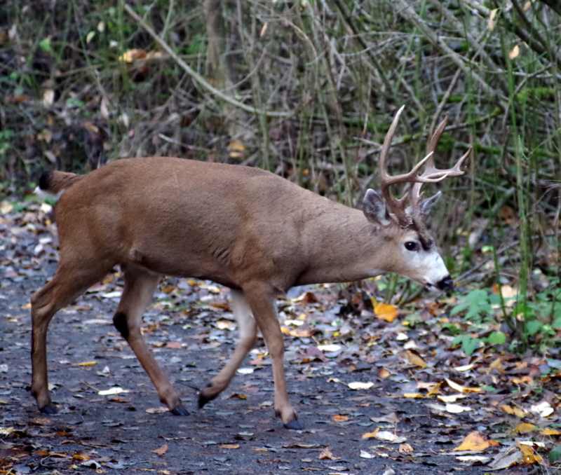 Satisfied with some decent pics I continued on my way, taking a diversion to check for horned owls in another part of the wood where they have been known to hang out, but they weren’t about, or couldn’t be seen if they were. Back on the main path, a doe jumped out in front of me and into the brush. Then I spotted her mate half hidden behind a tree. He cautiously came out and I got a shot of him crossing the path. With his pointy antlers I stayed well away in case he took a notion to shoo me off. I didn’t notice the odd antler that looks like it sprouted from between his eyes! Just a few yards further on I looked up to see a huge paper wasp nest that was now in plain sight.