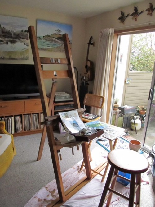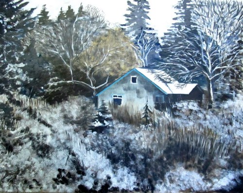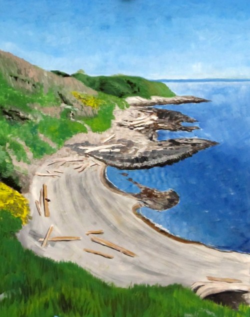 Last May, I went out with my portable paint set to do some plein air painting. I did a small painting from a cliff down at the ocean and took a photograph of the scene. Later I sketched it on a large board, planning to do a full size painting. It sat on my easel in the basement for a year, until today. I realized recently that I was avoiding painting large works because I didn’t like spending hours in the basement, where there is no daylight. So I thought about getting a strong but portable easel so I could paint upstairs and move around easily. I looked at one at my art shop but it was about $100. I then had a look at my heavy easel in the basement and realized that I could take it apart and get rid of the heavy bits, like the base on wheels, the heavy bottom tray, the counterweights and the sliding centre rail. So I ripped it all apart and was left with a much lighter easel. I set it up in the living room and spent all day painting. I should have figured this out long ago, but it took me a long time to come to the realization I didn’t like painting in a windowless room. Part of what finally got me moving was seeing the movie Mr. Turner, about JMW Turner. In Turner’s day of course, there was no artificial light. Seeing Turner portrayed at work in his studio with light from the large windows must have made something click, because ever since then I’ve had this idea in the back of my head that I should get going again with my easel painting. Whatever the reasons, I now have no excuse and hope to continue where I left off. Here are a few more sketches and paintings; one small, one medium and one large. It pays to work at various sizes, and especially at small scale, where you really can’t fuss with too much details.
