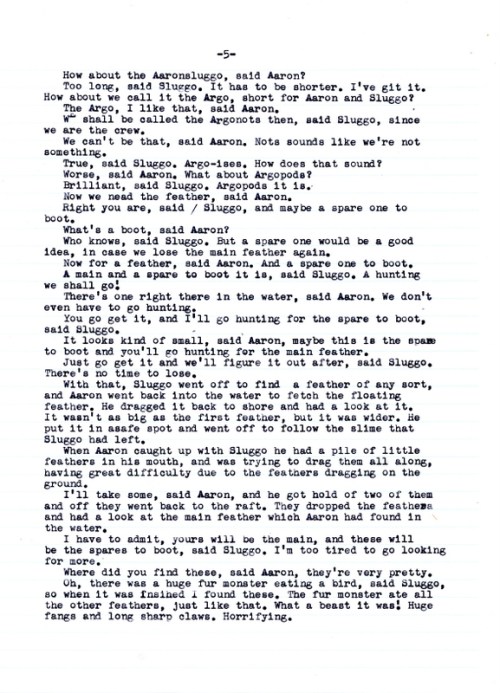 I typed my weekly letter to #1 son this morning on a 1940 Remington Model 5 Deluxe. Complete with alternate spellings, x outs, and skipped words even, but I think it’s better than an email that is perfect. I like imperfection. Perfection is an insult to the universe. I would never insult the Universe. God forbid. Speaking of which I have just completed my latest novel, which is a charming tale of a pair of intrepid gastropods who set off to explore the world, find a duck, and also the universe, none of which they comprehend or even recognize. It was typed, like all the stuff I write, except this stuff here, on a variety of old and older typewriters. I leave you with an excerpt from the first draft.