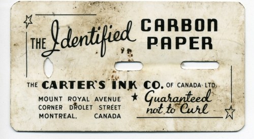 A reader from Montreal commented on an old post here regarding the former Carter’s Ink building in that city. He is an archeologist and was searching for information on that building when he came across my site. He referred me to an old photograph from 1928 of the Carter’s Inx (sic) building, and also to the present building – which has somehow shrunk! You can read the comments on the old post. He also brought to my attention a very interesting site – The Ribbon Tin Virtual Museum. This particular page has a variety of Carter’s erasing shields, the very item that inspired the original post. Big thank you to fellow McGill alumnus Nicolas Cadieux!