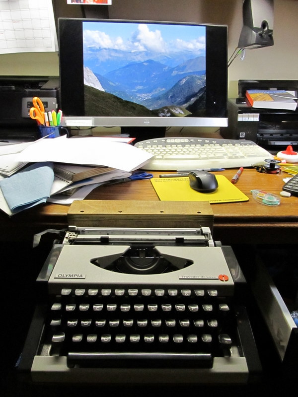 This is my desk and my reliable Olympia Traveller typewriter. When I am typing a novel I turn the computer screen off, but I thought it should have a pretty picture rather than the usual garbage. That’s Switzerland by the way. Where they make Lindt chocolate, and where my Hermes 3000 typewriter was made. Two things I am grateful for. I used the H3K today for a while, then an Olivetti 22, and also a Royal Caravan/Contessa/Tippa. The last is a machine with many pseudonyms! But a Hermes 3000 is always just that. Sublime, like the Swiss Alps.