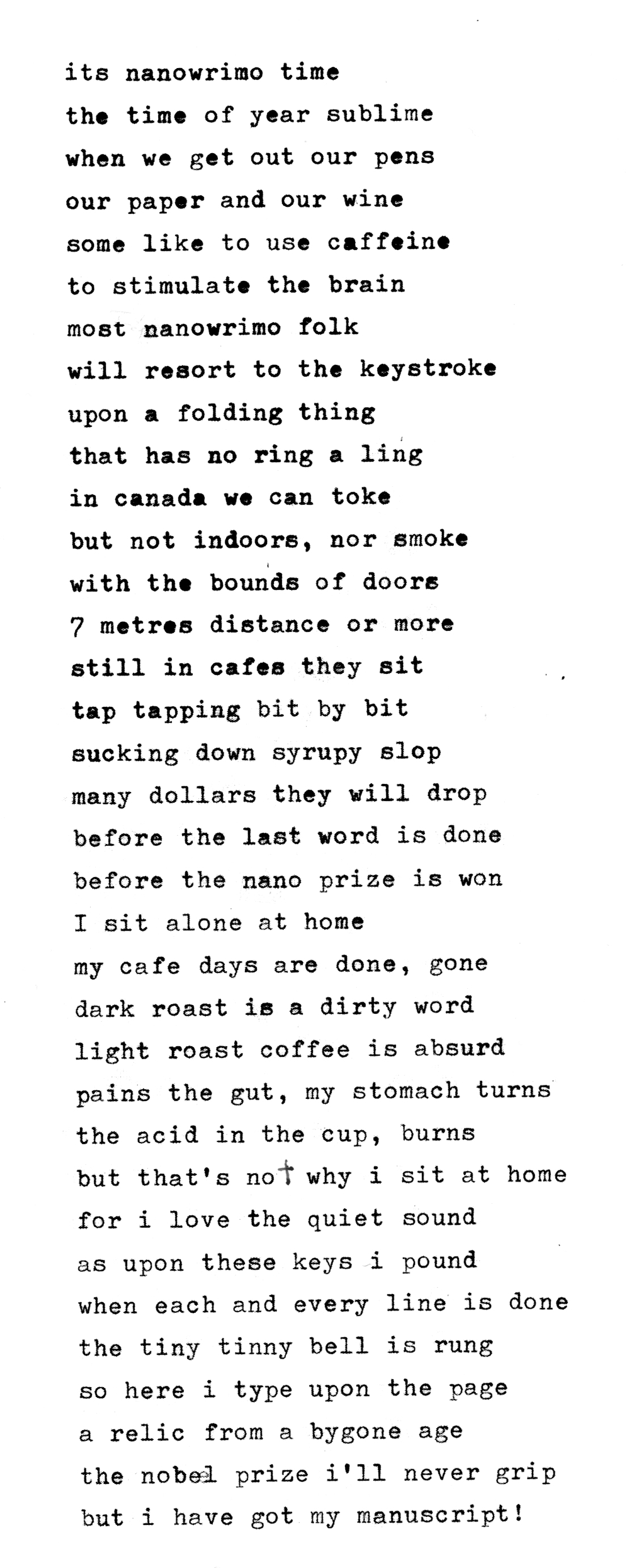 47,000 words. 25 days. 50 hours. 25 cups of tea. 22 pages of plot notes. 93 pages of typewritten draft. 1 Olympia Traveller. 1 Hermes 3000. 1 Smith Corona 5 (Eaton’s deluxe). 1 sore back. 1 case of nerves. 25 beers (dinner). 10 swims. 6 walks around the lake. Countless hours of pondering the plot. All just to say you wrote a book. A book you will publish yourself and that will not become a best seller, win the Booker, the Giller, the Pulitzer, or the Nobel or a million other prizes. Even if you think it should, which is ridiculous, but so what? Why else write a g–damned book?