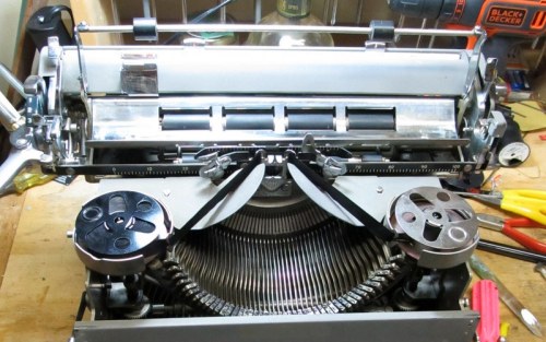 There are numerous blogs with information on the Super-Riter, but this is the first one to feature an actual open heart operation. Be sure you’re seated and have someone with first aid experience nearby while watching this, unless you’re a doctor. It is shocking! The back opens up with the removal of a few screws. First one removes the platen, however, achieved by flipping two levers and lifting it off. Dead simple. Oops, I didn’t mean to say dead, excuse me.