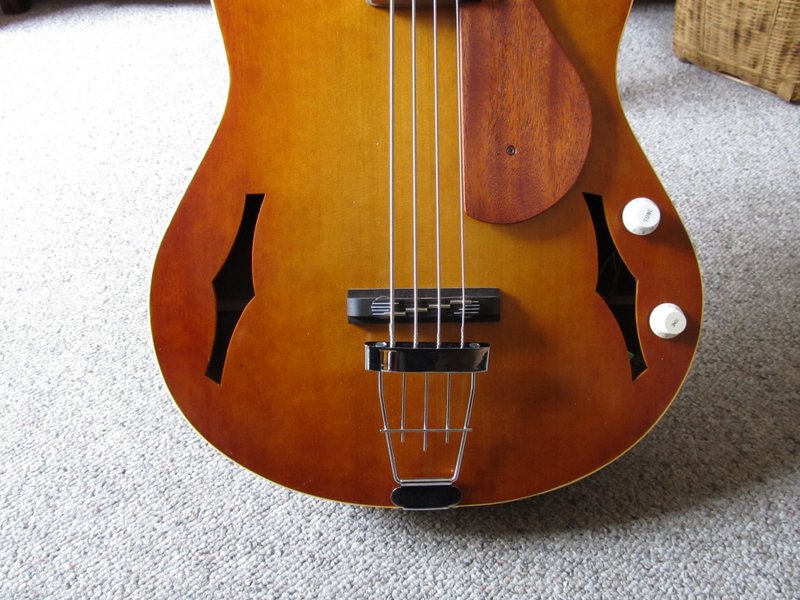 I used Gotoh bass tuning heads rather than the silly little bass tuners Hofners have. For a Hofner you must buy special short scale strings with reduced end wraps in order to fit into the tiny tuners. This looks good and is lighter weight, but it restricts the sort of strings you can usually find in the music stores. These tuners allow me to use all off the shelf strings. I put Ernie Ball Slinkys on it, which are very good and as cheap a string as you will find. Maybe one day I’ll try flat wounds, but they don’t offer much except for lower noise from the friction of your fingers. I have tried them on my guitars and I always go back to round wounds, because I like that friction under my fingers. It all depends on preferences of course.