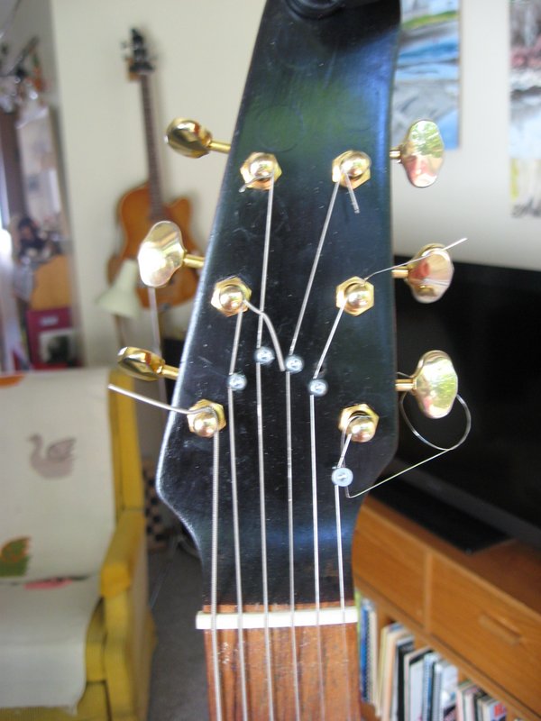 I had to modify the headstock to take 3 + 3 tuners, since that was all I had to work with and I don’t like the 6 in line ones much anyhow. I did this and installed the tuners and screws to act as posts for the strings in order to prevent the sideways pull of the strings from yanking the nut out of line. This was ugly but free and worked fine. The tuners were a nice set of Grovers acquired free from my sister. Thanks Val!