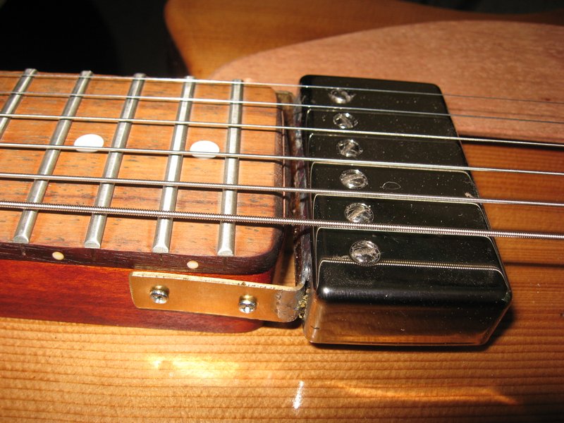 I hit on the idea of attaching it to the end of the neck with a bracket, like the Johnny Smith pickups on various archtop guitars. I got a metal pickup cover and soldered onto that a brass bracket, then stuck the legless pickup inside the metal casing and soldered it in place. I had a suspended pickup and all I needed was a guitar body on which to install it.
