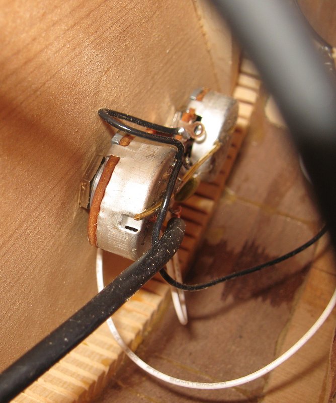 I didn’t worry about the extra thick top of over 4mm since the idea was basically an electric guitar. However, after I glued the braces on it had a very decent tap tone. I put the ribs and top together and prepped the holes for the two pots and the output jack, then attached the back. The top gave out an even better tone when the box was assembled, so I decided not to cut a sound hole or f-holes in the top until I heard how it sounded. After all, there was a decent sized hole in the back already.