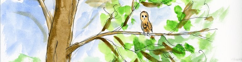 While they were looking an owl glided past their heads and silently beat it wings as it flew off down the path and into the forest. That was impossible to ignore and they started walking quickly down the path into the trees hoping to see the owl again, forgetting that they weren’t allowed to go into the forest. When they had walked for a while they saw the owl high up in a tree sitting on a big branch preening its feathers with its beak. They stood at the bottom of the tree and looked up at the owl. The owl stopped preening and stared at them.