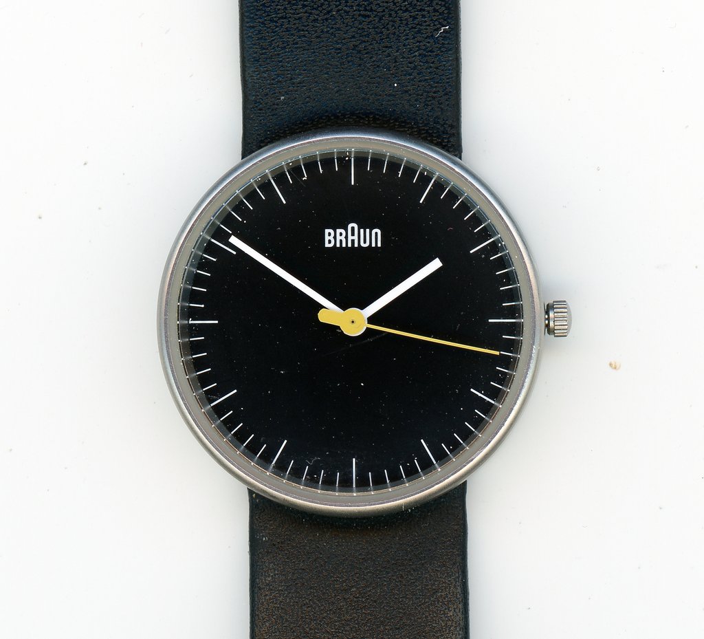 Rams gave me a tour of their design department where they were working on the latest Nizo Super 8 movie camera, among other things. I have owned lots of Braun products, like the coffee grinders, and the wall clock and alarm clock, as well as Braun electric shavers. I still own an old series 3000 shaver that continues to work well, but for the fact that I stopped shaving again and grew a beard. I was surprised however, when last week I spotted a Braun wristwatch in a consignment store for $18. I liked the look of it, and being an admirer of Braun products I decided to buy it. I pried the back off with some difficulty and replaced the battery (379) and it began to work. When I did some research I discovered that Rams didn’t design this watch, but it sure looks like something he would have designed.