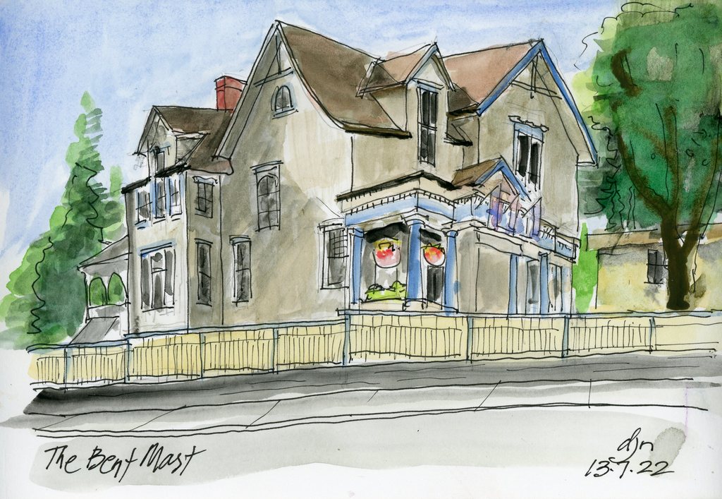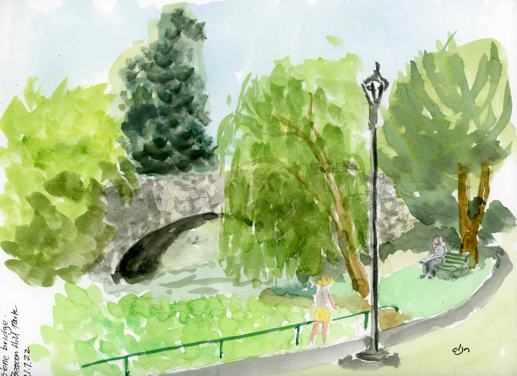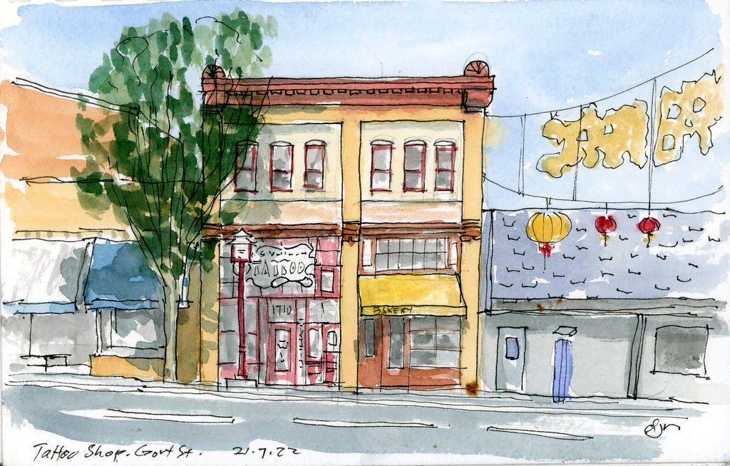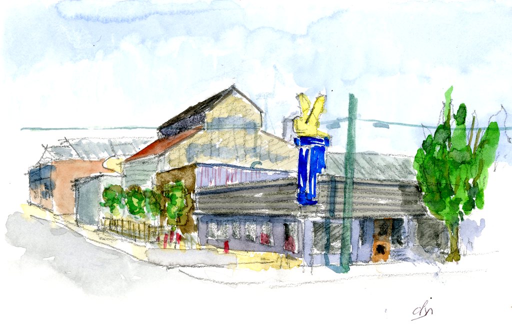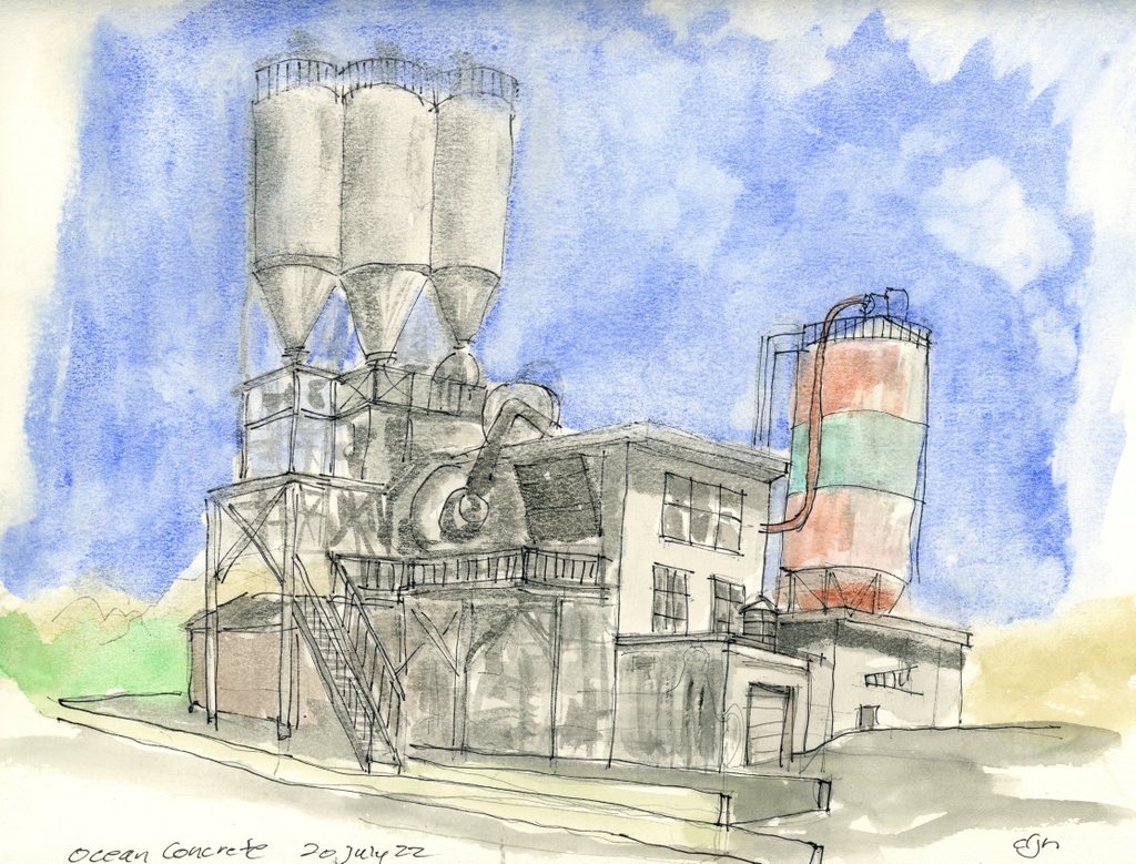Today’s ride took me to a huge fenced off field on the edge of downtown that was once a heavily polluted industrial site. The gates were open so I ignored the No Trespassing signs and rode my bike to a good spot where I sketched an old power station and a working asphalt plant. While I was there, several cars arrived and the folks walked out into the empty field at my back. Later on while drinking an expensive coffee at a nearby sidewalk cafe, I met two gents I’d seen at the field and we had a brief chat, whereupon they informed me that the acreage in question was going to be developed in a few years, once the master plan was ready.
