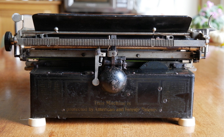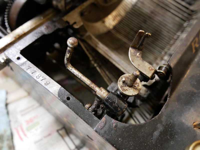 I found this ancient Royal 1 that was in terrible shape cosmetically, but upon inspection I wagered that it was fixable, so I bought it. Liberal applications of Deep Creep penetrating oil helped free up many sticking parts, along with some elbow grease and a wire wheel on my Dremel to remove the surface rust. There were two broken parts; the advance lever linkage and the “ear” of the yoke that limits the travel of same. I made a new link from a piece of aluminum, which fixed that issue. The ear proved to be unnecessary. I took off the platen and all the cover plates and did what I could to adjust the inner gears and so on. The spring motor needed a string and winding, which had to be done by winding the thing up and fastening the cord to it. The engineers designed a spring winding mechanism, but I was unable to free up the rusted set screw that locked the winding shaft. Other than that, the thing still works!