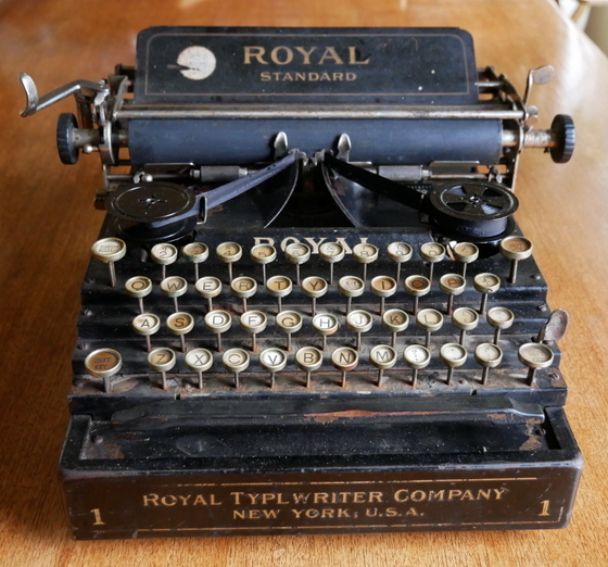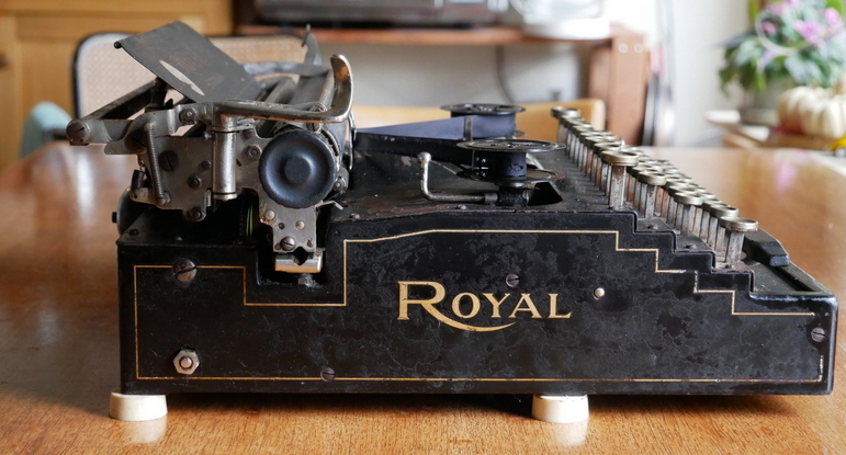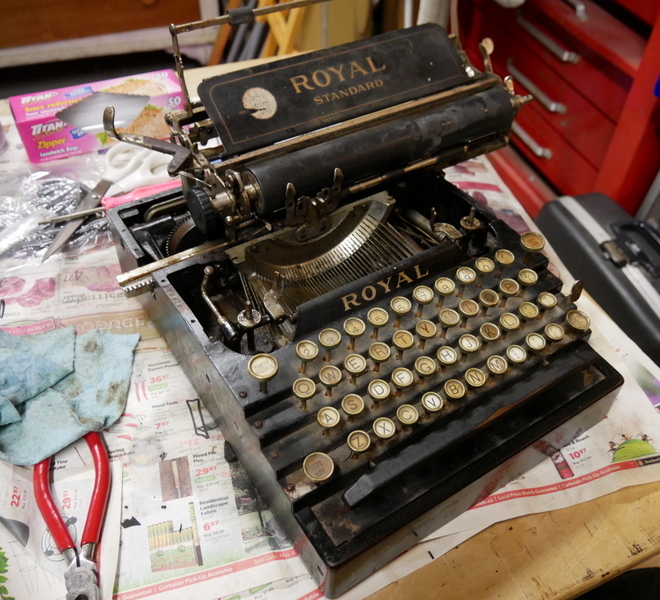 I found this ancient Royal 1 that was in terrible shape cosmetically, but upon inspection I wagered that it was fixable, so I bought it. Liberal applications of Deep Creep penetrating oil helped free up many sticking parts, along with some elbow grease and a wire wheel on my Dremel to remove the surface rust. There were two broken parts; the advance lever linkage and the “ear” of the yoke that limits the travel of same. I made a new link from a piece of aluminum, which fixed that issue. The ear proved to be unnecessary. I took off the platen and all the cover plates and did what I could to adjust the inner gears and so on. The spring motor needed a string and winding, which had to be done by winding the thing up and fastening the cord to it. The engineers designed a spring winding mechanism, but I was unable to free up the rusted set screw that locked the winding shaft. Other than that, the thing still works!