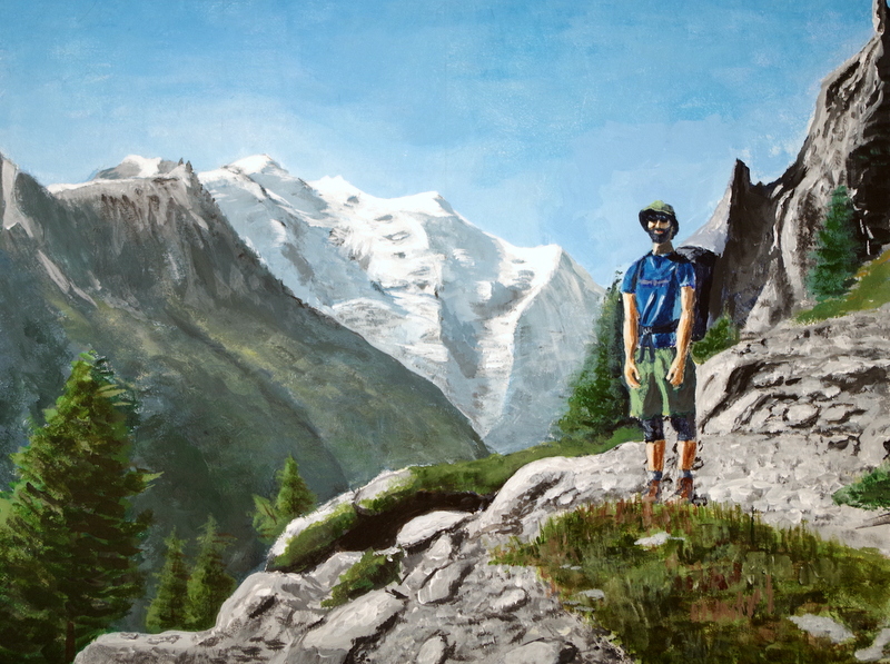 That could be me coming to a bridge over an idyllic mountain stream, but I just made this scene up while testing some new paints. One of those peaks could be Mont Blanc, too! In less than 2 weeks I will see for myself when I arrive in Chamonix to hike the trail known as the Tour du Mont Blanc, or TMB. Training with a pack is one thing, but trying to decide on what to bring is another. The perfect is the enemy of the good, yet I waste hours of thought and time dabbling with various paints, brushes, papers and so on, until I almost feel like forgetting about sketching altogether! However, that would be dumb, because I know that when I get there I’ll be itching to do a sketch – so around it goes. This fantasy was done on heavy watercolour paper using cheap acrylic paints that came in a set. The tubes hold 10ml each, and as soon as I squeezed some out I knew that 10ml would not be enough. For one thing the paint is too thin, and doesn’t cover anywhere nearly as well as high quality paint does. Regular size tubes hold 60ml, which is way too much, but there aren’t any good paints sold in smaller tubes. Winsor Newton makes sets of 20ml tubes however, so I may try those. No doubt it’s decent paint. On any hiking trip you one should keep the gear down to a minimum, thus my sweating over the size of the paint tubes. It seems ridiculous, but ounces add up to pounds, as they say. Two more weeks to get it all sorted…