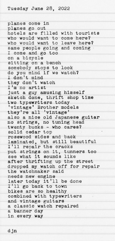 I wonder if typewriters were all $5 each, and there were half a dozen in every thrift shop, would anyone bother to collect them? I think not. We tend to value things that are rare and or expensive. If every typewriter was $5, which one would I buy to use? Not some rare old thing, unless it worked so well that I preferred using it over a better made model. When one removes price and rarity from the equation, then we find an entirely different set of values. I think of this as something like a blind test. I find this to be true for guitars, especially.