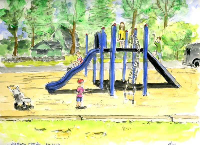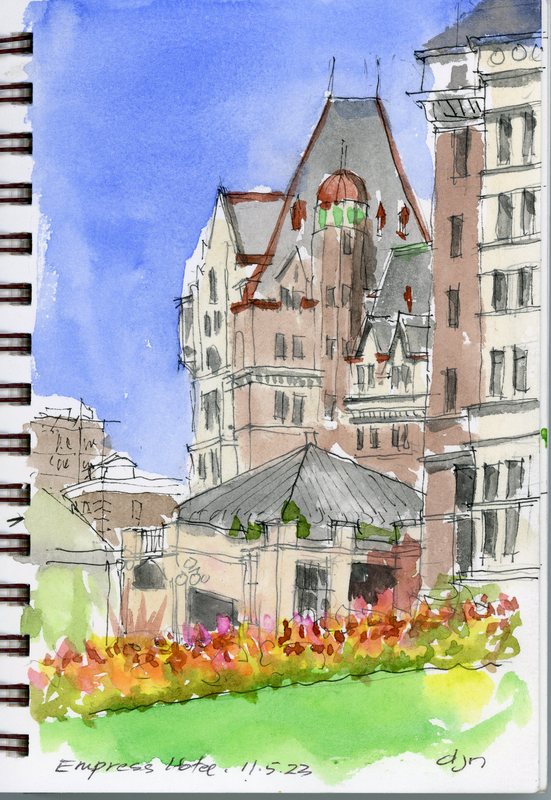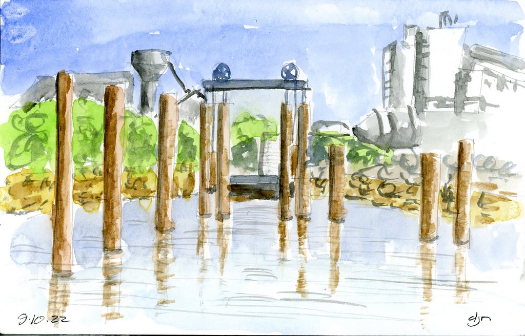 I’ve never even been to Cacouna, but one of my boys went there once, just to check out where his great grandfather was born. I have been to Buttle Lake here on Vancouver Island however, numerous times in fact. Last week we were camping there again and I managed to do one measly watercolour despite having nothing else to do but eat, sleep, swim, and go for walks. I am not quite so dedicated to my art as AY was, but here is my sketch.