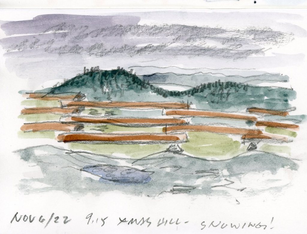 I picked up an interesting art book yesterday, called AY’S CANADA. Note the similarity between the photo above and the pencil sketched church on the left side of the book cover below?