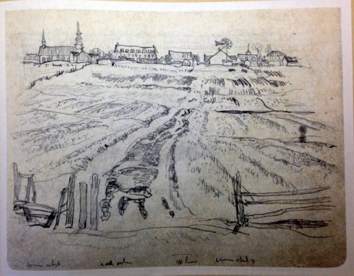 AY Jackson, one of the renowned Group of Seven artists who invented Canadian modern art about a century ago, liked to roam around rural Quebec with his paints and sketchbooks. In 1921 he drew a pencil sketch that included the same church shown above, in the village of Cacouna, Quebec – on the lower south shore of the St. Lawrence River. When I grabbed the book off the shelf at my local thrift shop I had no idea that AY had ever been to Cacouna. Nor did I have any clue as to where the cover illustration was sketched.
