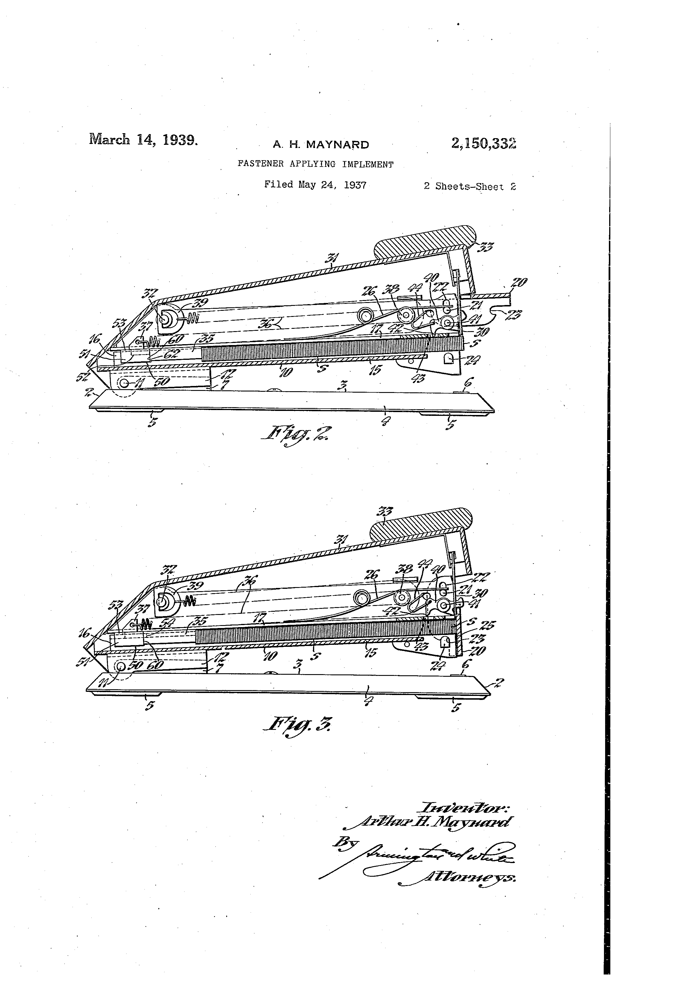 Here’s a US Patent drawing for the same stapler from 1939, filed 1937. This fellow Maynard filed a whole lot of patents, many for staplers, but lots of other stuff. It wouldn’t surprise me if he even designed a typewriter…