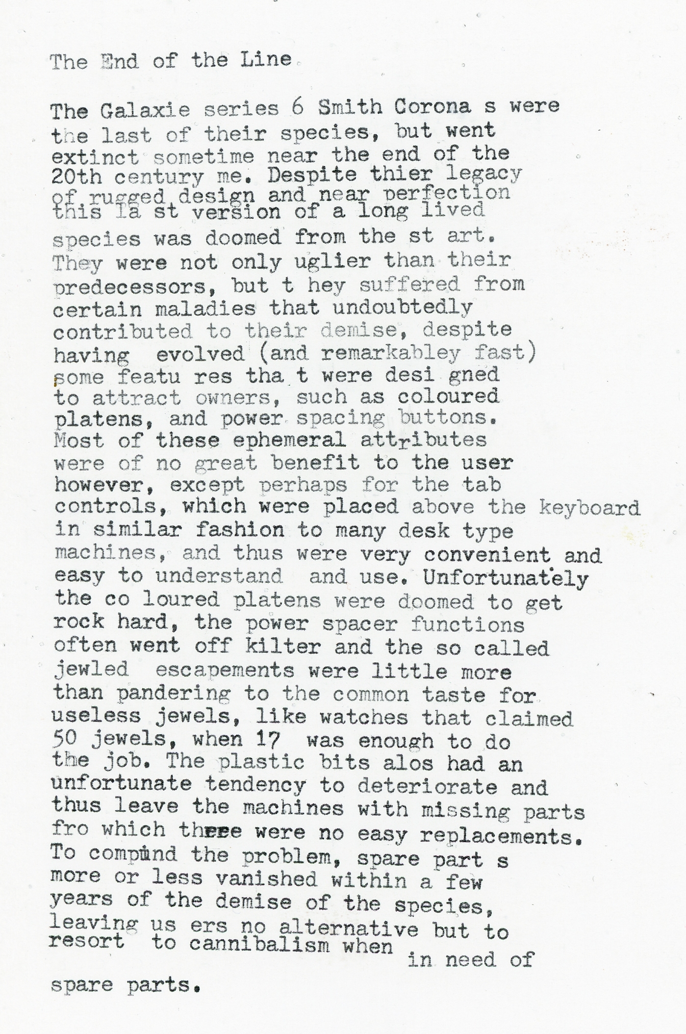 Super-Riter is back in one piece now and recovering well. It’s a marvelous bit of engineering, and it types with near perfection. The sole downside is the weight, 32 lbs. It’s so heavy that when you get typing, the machine will begin to sway even a solid table due to resonance and its mass. Placed on a heavy table, I imagine it would be heavenly. On a TV tray, extremely risky! Not for card tables this sucker.