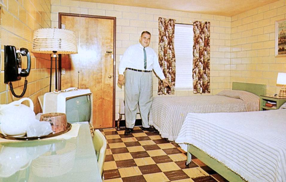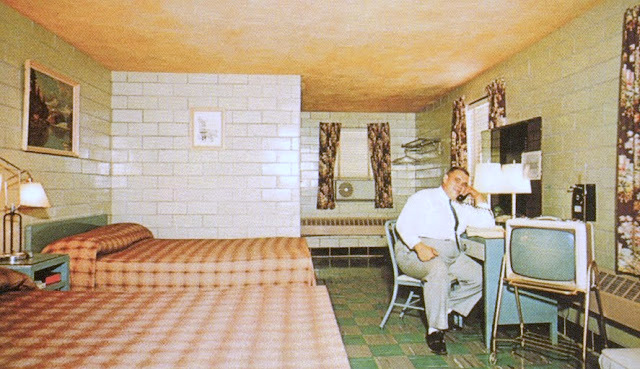 My search turned up several more gems with Earl-Ray in his motel. Observe how each room shown has different coloured floor tiles. No boring grey carpets here!