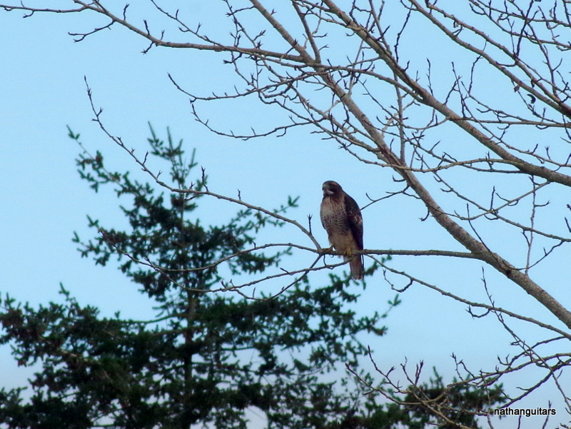 Then I spied the Hawk in a tree. Haha! It was back. I stepped off the path and took a picture with the long lens, then hurried forward. By the time I reached the tree in question the hawk was up circling.