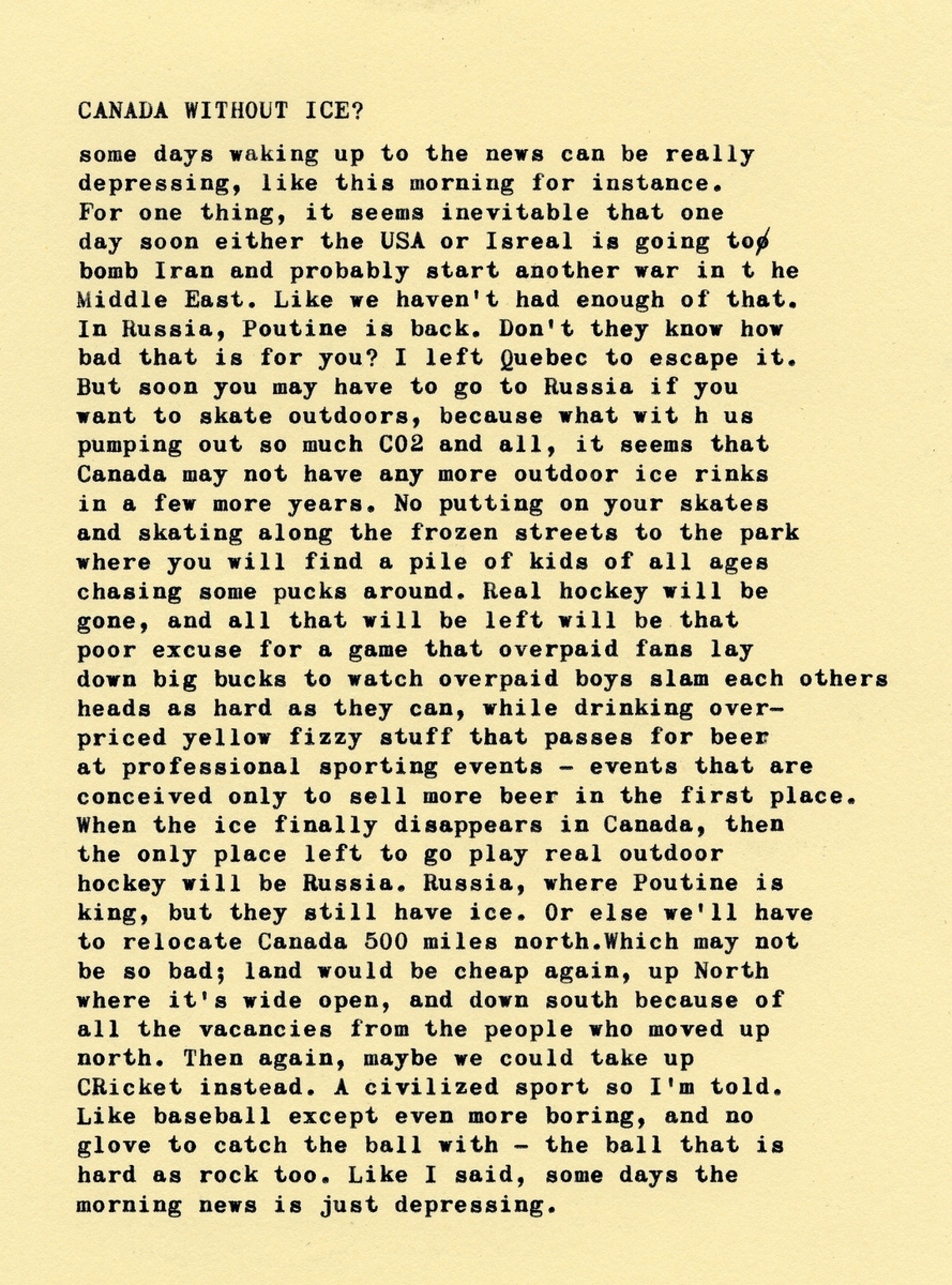 A gust of wind blew Proulx’s black fedora into centre ice right in the path of one of the Irish players. He slashed the hat on his backhand sending it sailing out of the rink. Like a kite it soared into the air, where the blustering wind carried it far away across a snowy field.