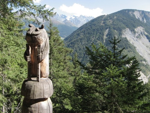 Exactly one year ago today I flew to Germany to hike the Tour de Mont Blanc with my son, Terry. While on the trail in Switzerland, we passed a series of carvings made from tree trunks. This excerpt from A Walk Around Mont Blanc explains where the whole Sluggo thing started: